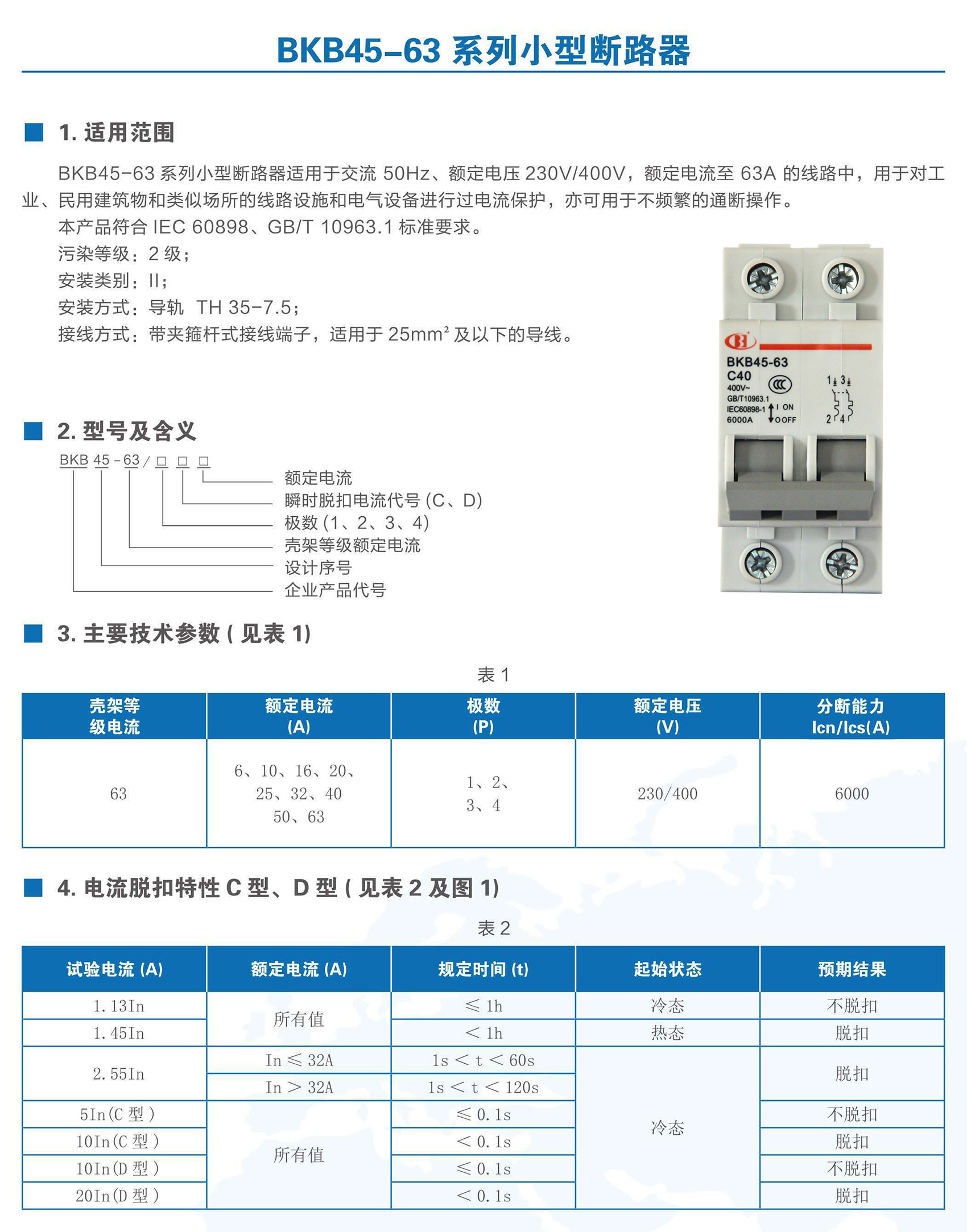 BKB45-63系列小型断路器适用于交流50Hz,额定电压至400V,额定电流6~63A,额定绝缘电压400V的系统线路中。用来对建筑电厂、变电站、电信、交通、冶金、工矿业等及类似场所的系统线路、电气设备进行过电流保护,也可以用于不频繁的通断操作。适用于非专业人员使用且不需要进行维护。本产品符合GB/T 10963.1、IEC 60898-1标准。