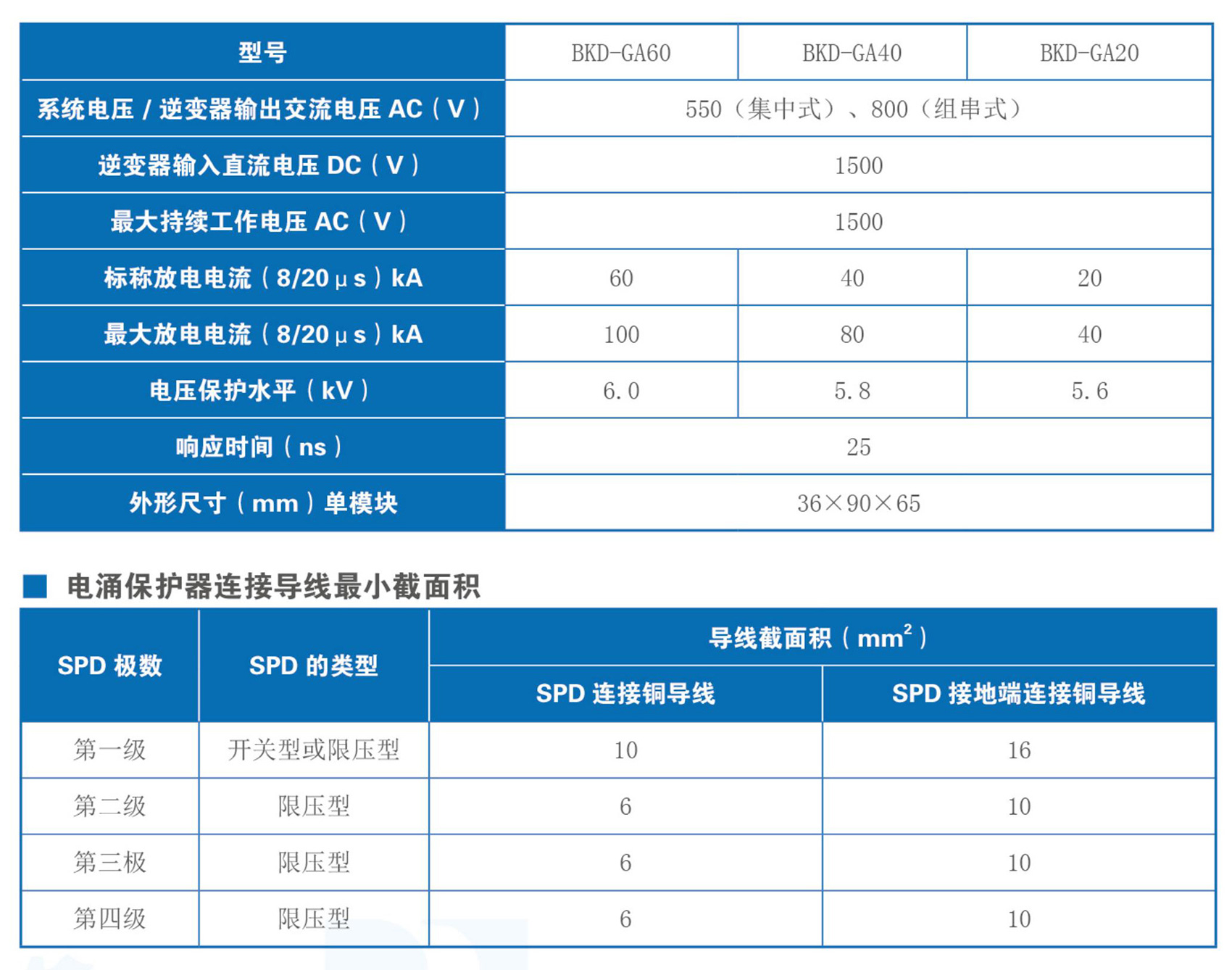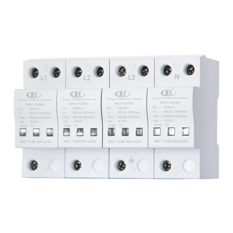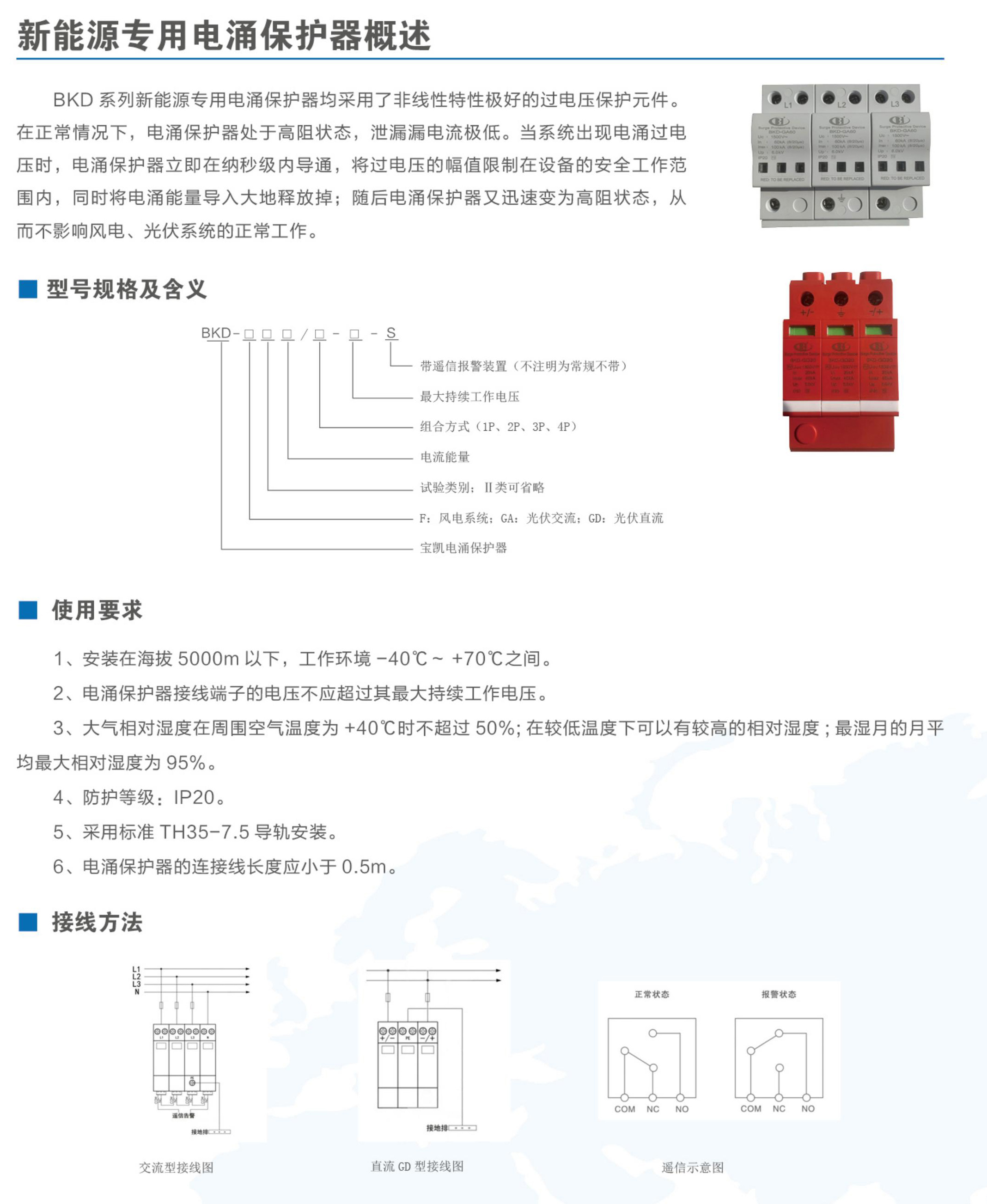 BKD系列新能源专用电涌保护器均采用了非线性特性极好的过电压保护元件。在正常情况下,电涌保护器处于高阻状态,泄漏漏电流极低。当系统出现电涌过电压时,电涌保护器立即在纳秒级内导通,将过电压的幅值限制在设备的安全工作范围内,同时将电涌能量导入大地释放掉;随后电涌保护器又迅速变为高阻状态,从而不影响风电、光伏系统的正常工作。产品符合GB/T 18802.11、GB/T 18802.11标准。